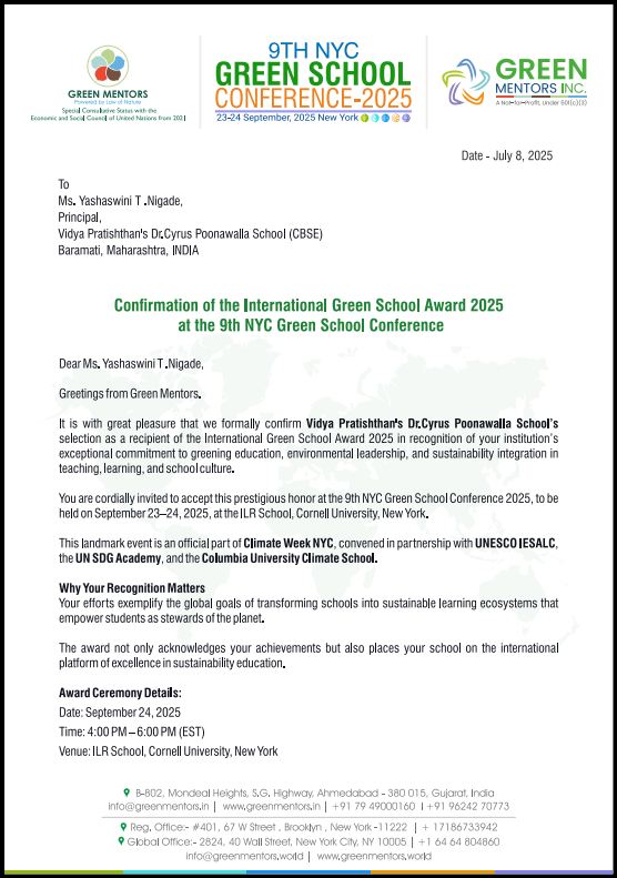The upcoming Green School Conference in New York will bring together leading educational institutions from around the globe, celebrating their contribution to sustainability and green education. Vidya Pratishthan’s Dr. Cyrus Poonawalla School will proudly represent India, sharing its journey, innovations, and leadership in greening education with a global audience.