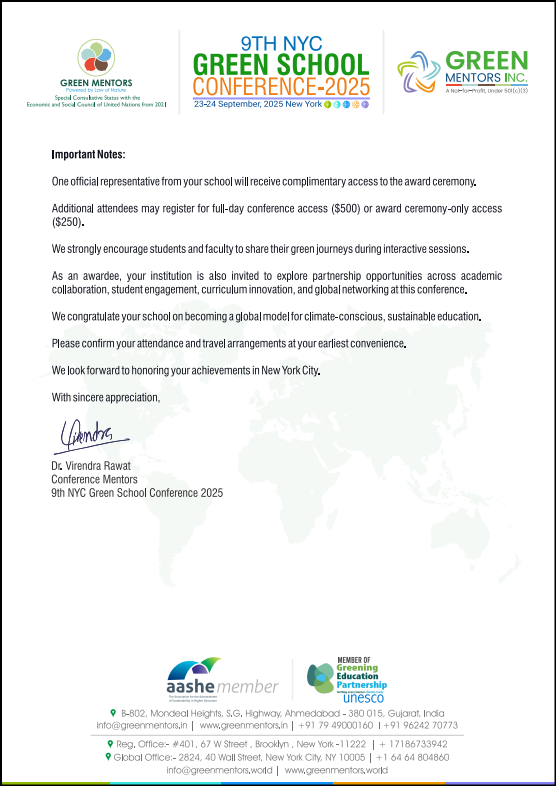 This accomplishment paves the way for the school’s participation in the esteemed 9th NYC Green School Conference 2025, scheduled to be held on 23-24 September 2025 in New York City, during the United Nations General Assembly and Climate Week NYC.