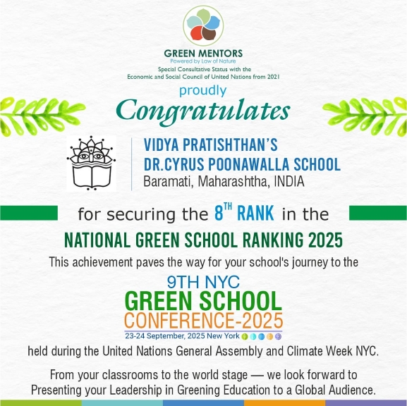 In a remarkable achievement, Vidya Pratishthan’s Dr. Cyrus Poonawalla School, Baramati has proudly secured the 8th rank in the National Green School Ranking 2025. This prestigious recognition has been awarded by Green Mentors, an international organization holding Special Consultative Status with the Economic and Social Council of the United Nations since 2021.